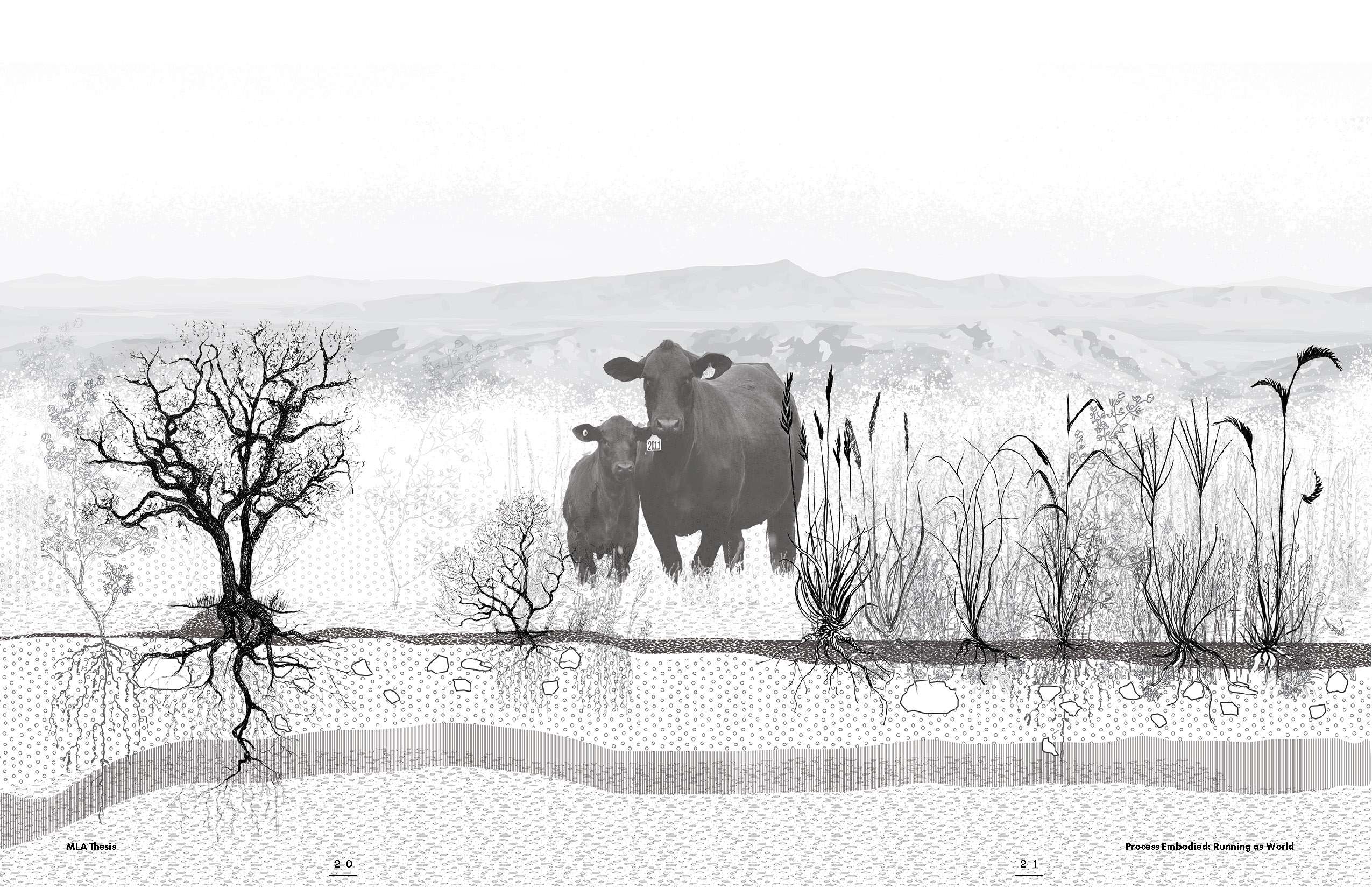 Ranching at the end of the 19th century greatly modified local landscapes. In the Chihuahuan Desert, water is delivered in pulses, interspersed with dry periods, which uncouple soil nutrient cycling processes from plant uptake and allow more opportunity for redistribution or export of nutrients. Water, wind, and animals, in this case, runners too, transport nutrients, creating strong spatial patterns of resources, influenced by the interactions of climate, topography, soils, and vegetation. Grasses constitute much of the belowground biomass with shallow fibrous roots that hold organic soil in place and avoid erosion. In desert shrublands, redistribution of resources creates distinct islands of fertility around shrubs, separated by depleted interspaces. Some plant sketches are part of a collaborative study with painter Fernando Barba.